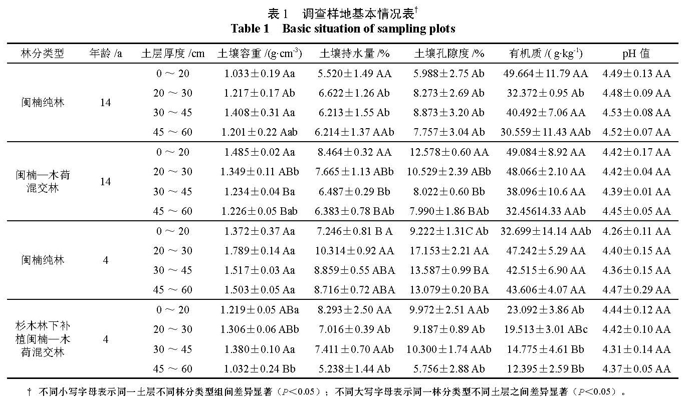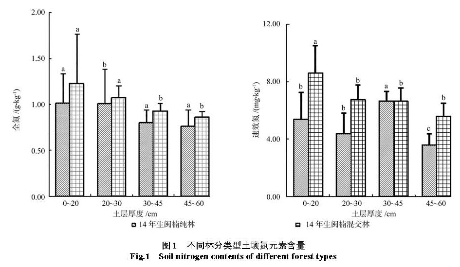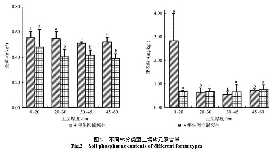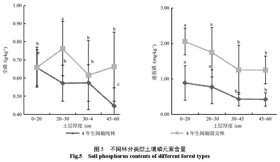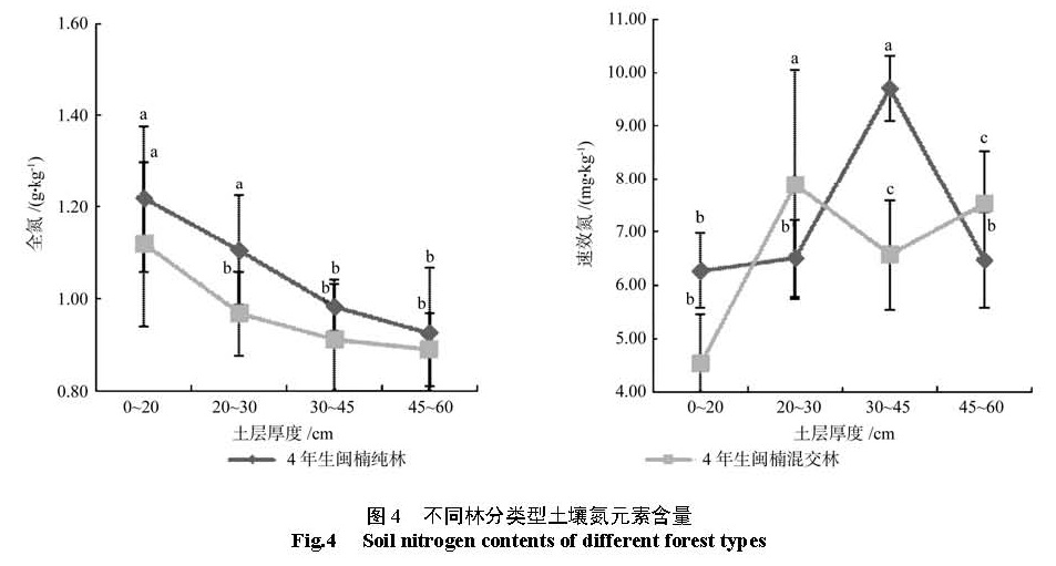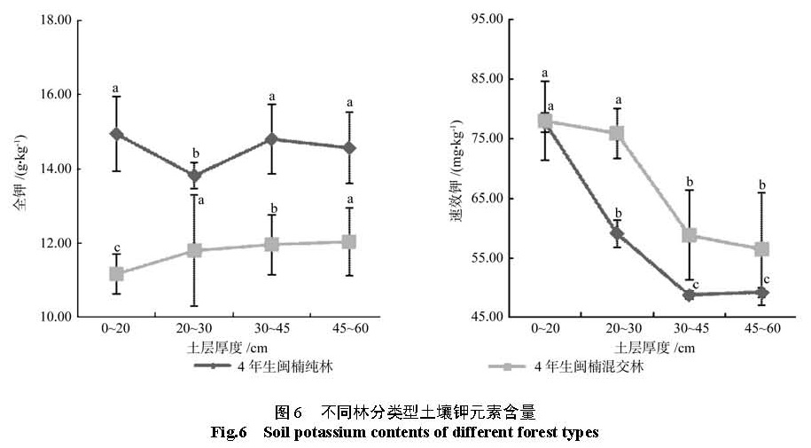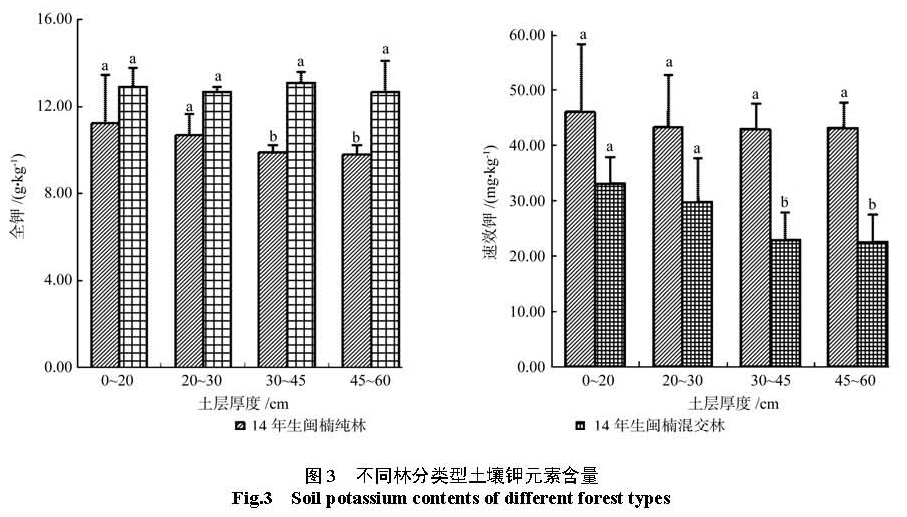 为了研究不同林分类型闽楠人工林土壤氮、磷、钾元素含量以及其随土壤层次分布的变化规律。以湖南省金洞林场 14年生闽楠 -木荷混交林、 14年生闽楠纯林、杉木林下补植 4年生闽楠 -木荷混交林, 4年生闽楠纯林为研究对象,对 4层深度 (0~ 20、20~ 30、30~ 45、45~ 60 cm)土壤的氮、磷、钾等养分实测数据进行对比分析。结果 如下:氮、全钾元素含量在整个土层 (0~ 60 cm)中、速效磷元素含量在 20~ 60 cm土层中 14年生闽楠—木荷混交林较 14年生闽楠纯林多 28.15%、23.82%、11.49%,全磷及速效钾元素含量 14年生纯林较混交林多 65.97%、26.95%。林下补植 4年生闽楠混交林林分土壤中表层和底层速效氮较 4年生闽楠纯林多 21.31%、16.22%;磷及速效钾元素含量在整个土层 (0~ 60 cm)中较 4年生闽楠纯林多 92.53%、16.11%,4年生闽楠纯林土壤中全氮及全钾含量较林下补植混交林多 8.74%、23.90%。这些结果表明 14年生闽楠—木荷混交林土壤养分水平较 14年生闽楠纯林高,杉木林下补植 4年生闽楠混交林分土壤速效元素含量比4年生闽楠纯林多,营造闽楠—木荷混交林可以改善由于杉木连载造成的地力衰退,为闽楠人工林近自然经营提供理论依据。