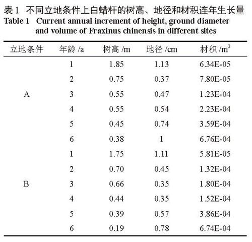 表1数据表明,两立地上白蜡杆材积连年生长量1~4 a 增长缓慢,4 a 后迅速增长,二者的变化趋势趋于一致,但总的来说,A 立地白蜡杆材积生长量略高于B 立地,方差分析差异不显著。