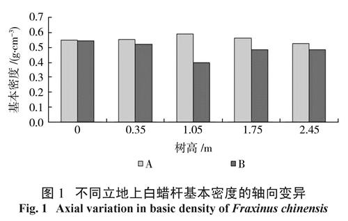 图1 不同立地上白蜡杆基本密度的轴向变异