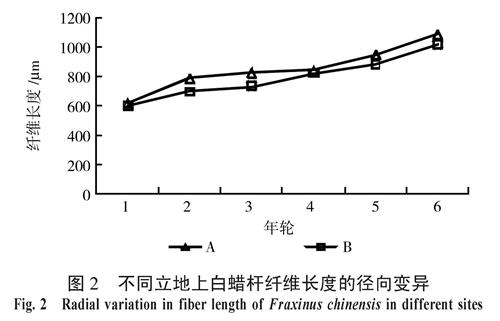 图2 不同立地上白蜡杆纤维长度的径向变异
