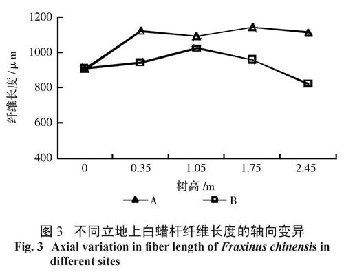 图3 不同立地上白蜡杆纤维长度的轴向变异