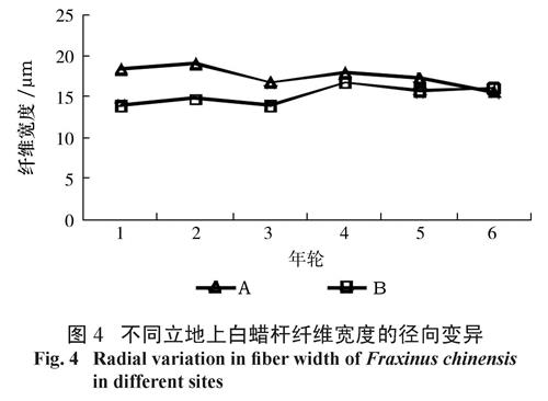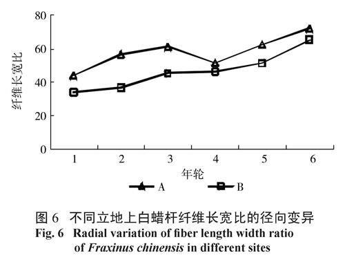 (3)两个立地条件上纤维形态特征径向变异规律是一致的。白蜡杆纤维长度、纤维宽度、纤维长宽比,不同立地上差异显著,其中纤维长度在株内不同高度间达到了 0.05水平的显著差异,纤维宽度分别在株内不同高度间和径向年轮间差异均达到了显著水平。纤维长宽比在株内不同高度间差异显著。