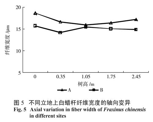 图5 不同立地上白蜡杆纤维宽度的轴向变异