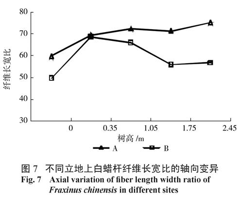 Fig.7 Axial variation of fiber length width ratio of Fraxinus chinensis in different sites白蜡杆木材纤维长宽比的轴向变异规律不太明显。随着树干高度的增加, A立地白蜡杆的纤维长宽比由树干基部向上略有增加,到树高 2.45 m处大最大值;而 B立地白蜡杆的纤维长宽比自树干基部向上是先增加然后又缓慢下降,最大值出现在 0.35 m处(见图 9)。方差分析表明 :两个立地条件上白蜡杆的长宽比差异显著,株内不同高度间长宽比差异也显著。