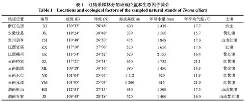 Table 1 Locations and ecological factors of the sampled natural stands of Toona ciliate1.2 试验方法