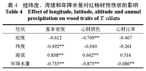 Table 3 Variance analysis of wood traits in natural stands of T. ciliata2.2 生态环境因子对红椿材性性状的影响