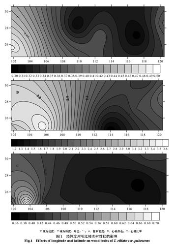 Fig.1 Effects of longitude and latitude on wood traits of T. ciliata var. pubescens密度、心材颜色和心材比率等性状表现较为优异,为获得材质好的红椿木材,种植区应放在红椿分布区的西南部。