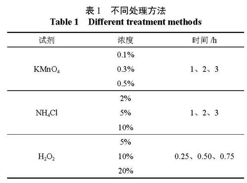 挑选颗粒饱满、大小一致的种子,分别设置 3种不同浓度和浸种时间的 KMnO4、NH4Cl、H2O2溶液处理种子(见图1),然后用蒸馏水清洗干净,分别放置于铺有两层滤纸、直径为 9 cm的一次性培养皿内培养,放置人工气候箱中培养,设置光照 14 h,温度为 25 ℃;黑暗 10 h,温度为 20 ℃,全天湿度 75%。每个处理 50粒种子, 4次重复,以物理处理(初始温度 45 ℃蒸馏水浸种 24 h)为对照。